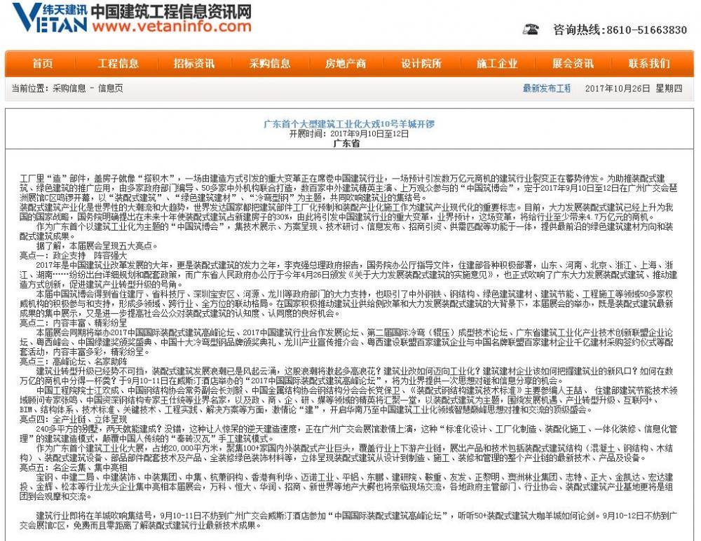 中國招標采購導航網發布有關2017中國筑博會·廣州開幕式的報道 (2017-10-30)