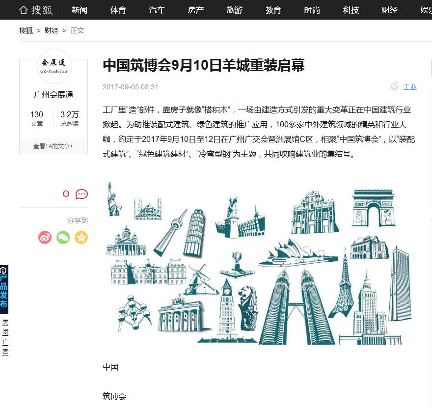 南方都市報在搜狐·財經網發布有關2017中國筑博會·廣州的報道 (2017-11-01)